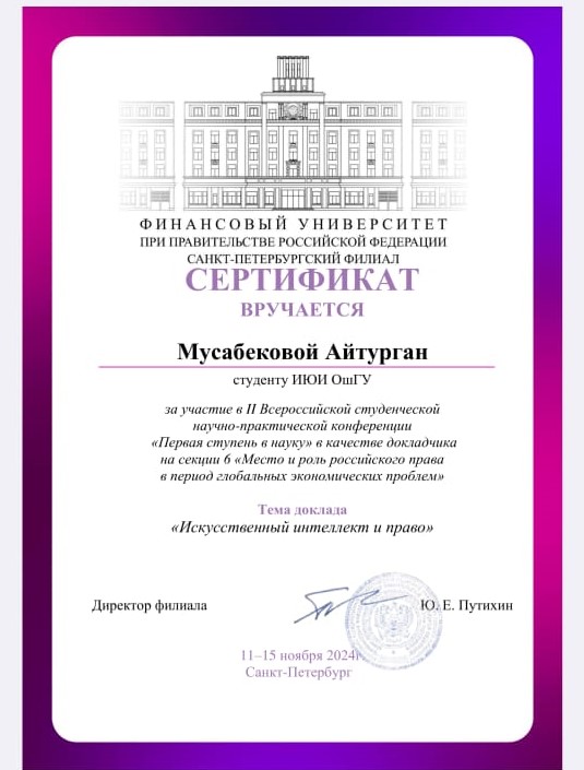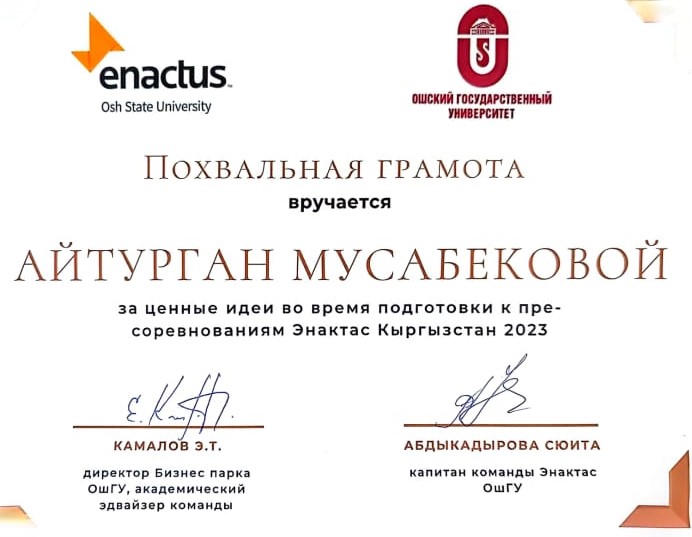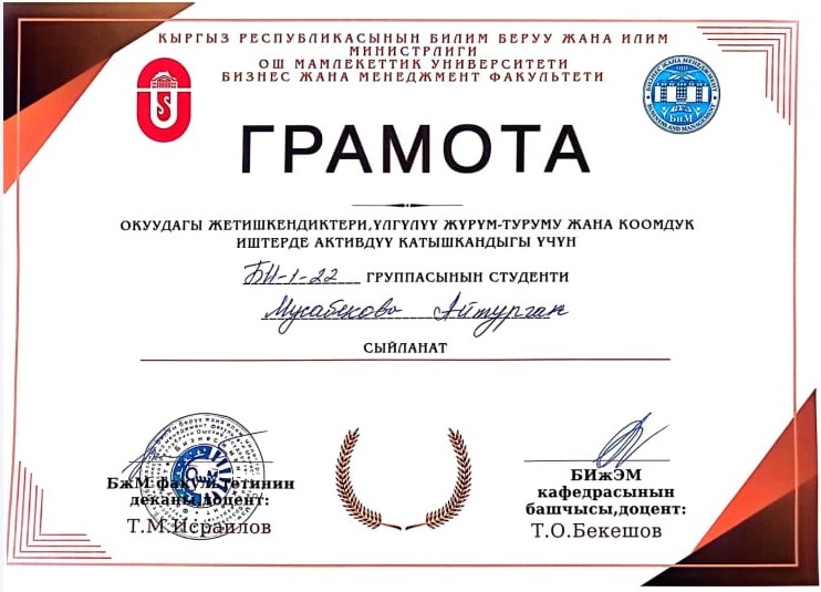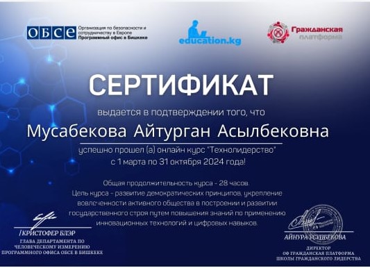 Студентка 4 курса направления "Бизнес-Информатика" с сильным аналитическим мышлением и стратегическим подходом к решению задач. Интересуюсь бизнес аналитикой и применением AI/ML в бизнес-процессах. Быстро осваиваю новые инструменты и технологии. Ищу возможности для стажировки/работы В сфере анализа данных. Владею hard skills: Microsoft Office, Canva, Figma, ArchiCAD. Языки: Кыргызский B1, русский C1, английский A2
